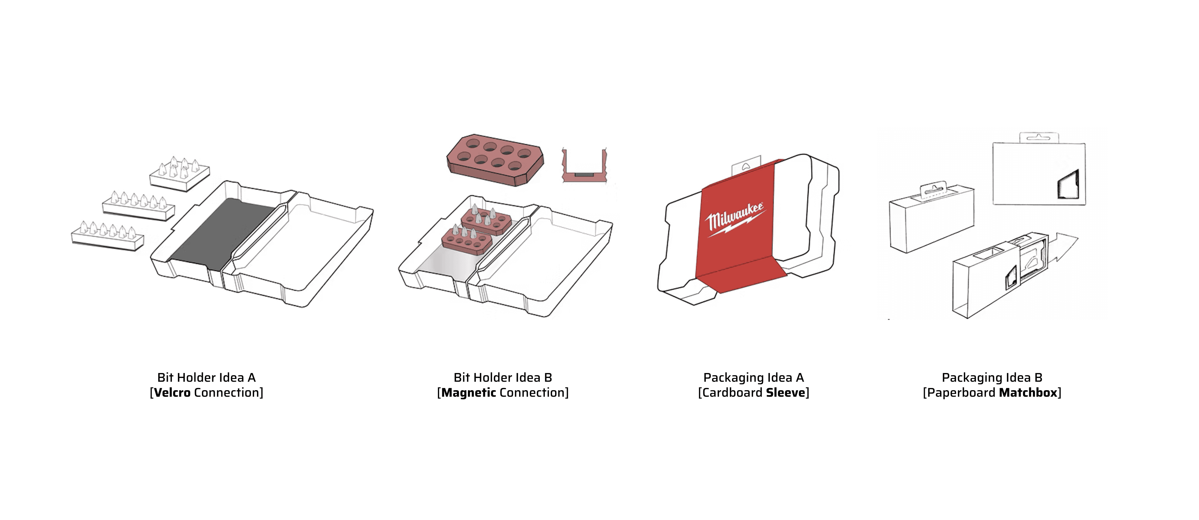 The final design combined a hard-shell case, magnetic bit holders, and compact paperboard packaging into a more usable and efficient system.