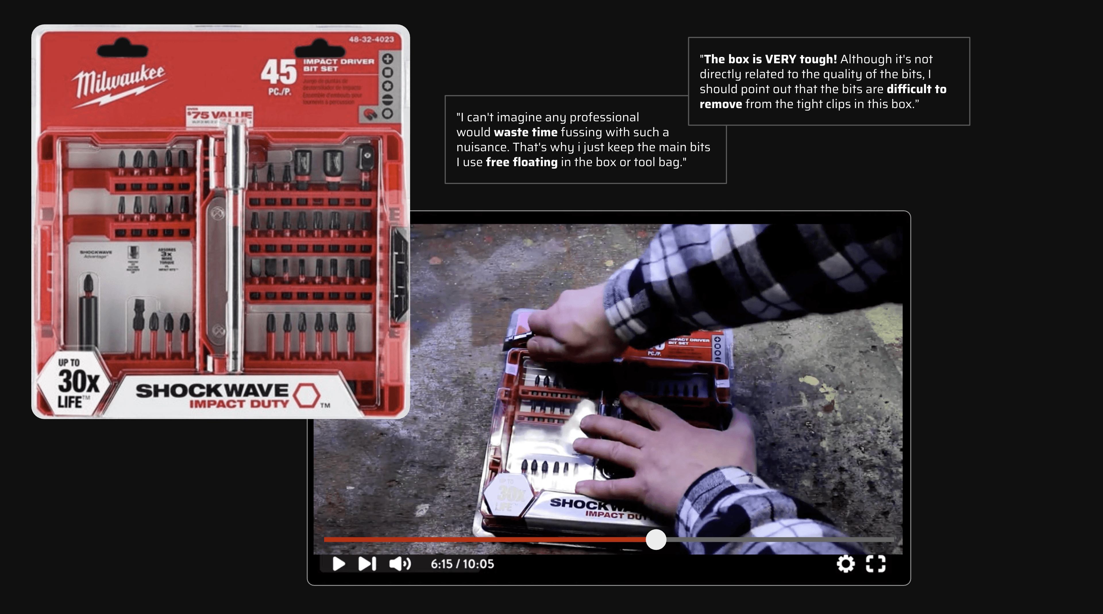 This driver bit set packages a hard case with internal bit holders. The product itself performed very well, but key parts of the experience weren’t holding up to consumer expectations.